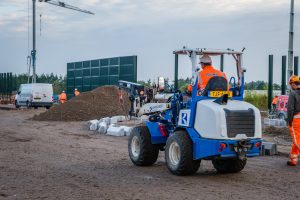 Een smalle hydraulische rupsdumper voorzien van een laadkraan en hierdoor ideaal voor middel zwaar transport in beperkte ruimte, bijvoorbeeld langs de spoorbaan via het schouwpad.