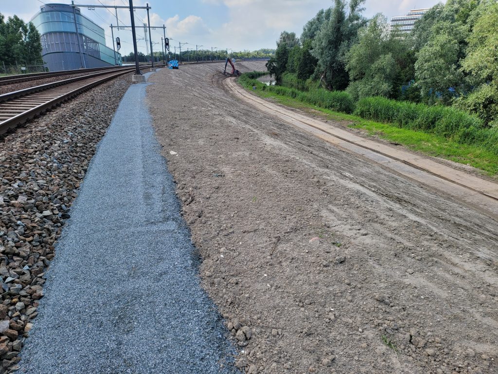 Knipscheer Rail-Infra BV is voor ProRail eind 2020 begonnen met de aanpak ‘Verbeteren Baanstabiliteit’ van circa 16 km spoordijk in Amsterdam en Diemen. Deze verbetering bestaat onder andere uit grondwerk aan het spoortaluds, bermen inclusief schouwpaden waarbij totaal circa aan 80.000 m³ grond is verzet.